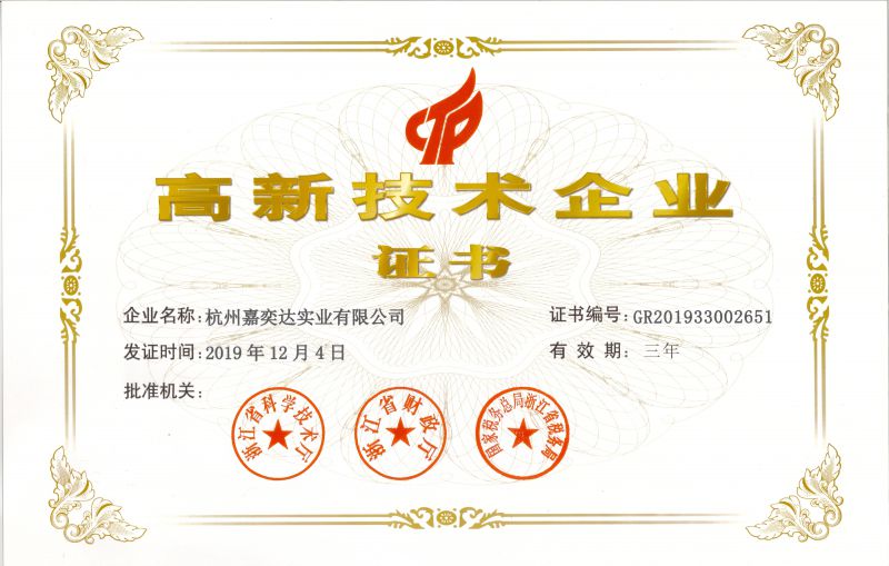 近日,由科學(xué)技術(shù)廳、財(cái)政廳和稅務(wù)局,聯(lián)合授予杭州嘉奕達(dá)實(shí)業(yè)有限公司為國(guó)家級(jí)“高新技術(shù)企業(yè)”的榮譽(yù)稱號(hào)并頒發(fā)證書。